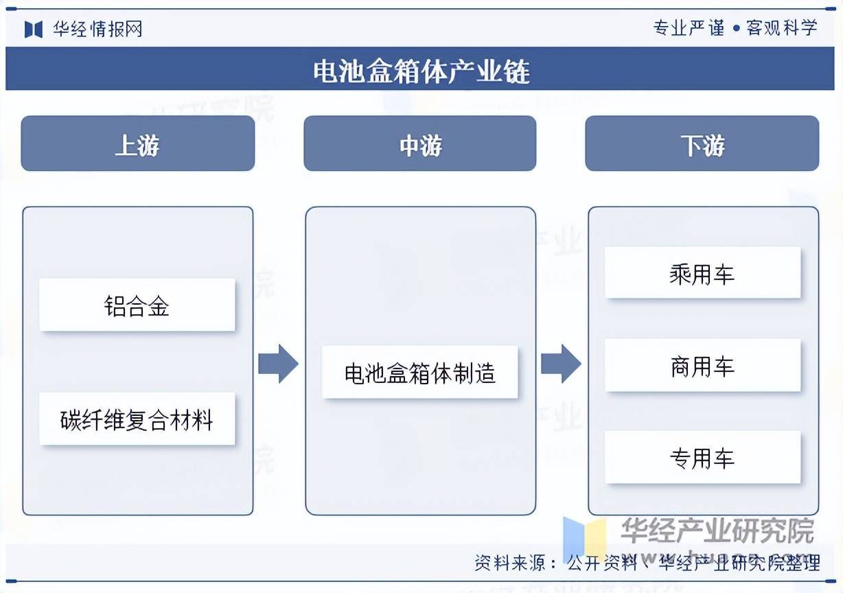 电池盒箱体产业链上游主要是原材料供应,包括铝合金、碳纤维复合材料等。其中,轻量化与高安全性使得铝合金电池包壳体成为动力电池外壳主流。电池盒箱体产业链中游是电池盒箱体制造环节电池盒箱体。产业链下游是锂电池和新能源汽车领域。电池盒箱体产品的需求及价格主要受到下游行业的影响。